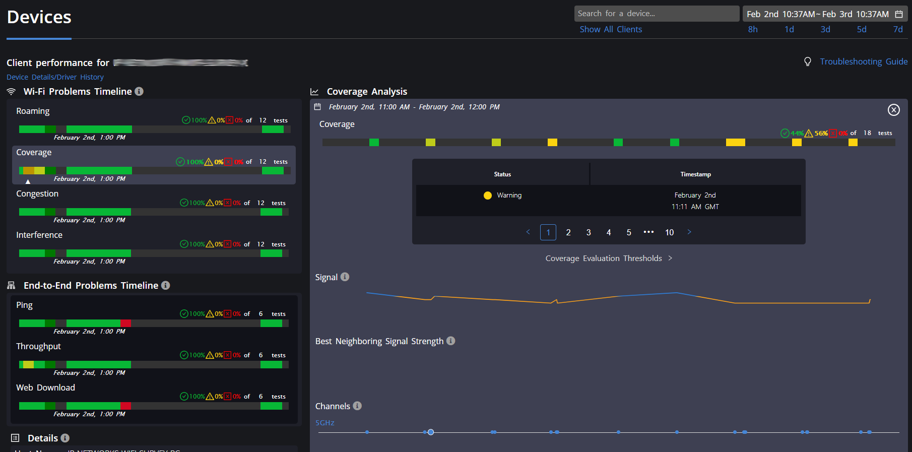 (3 of 5) Wi-Fi Performance/Coverage Detail for a Client Device (Example shows coverage issues at a particular time as experienced by a particular device)