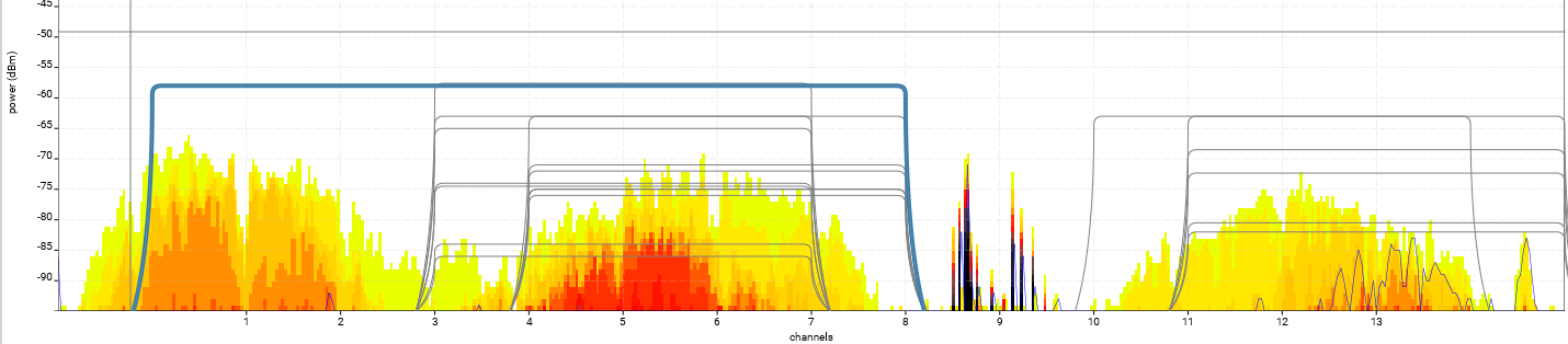 We see a rogue 40MHz-wide Wi-Fi channel (highlighted in blue), that is using up 8 of the 11 5MHz frequencies.