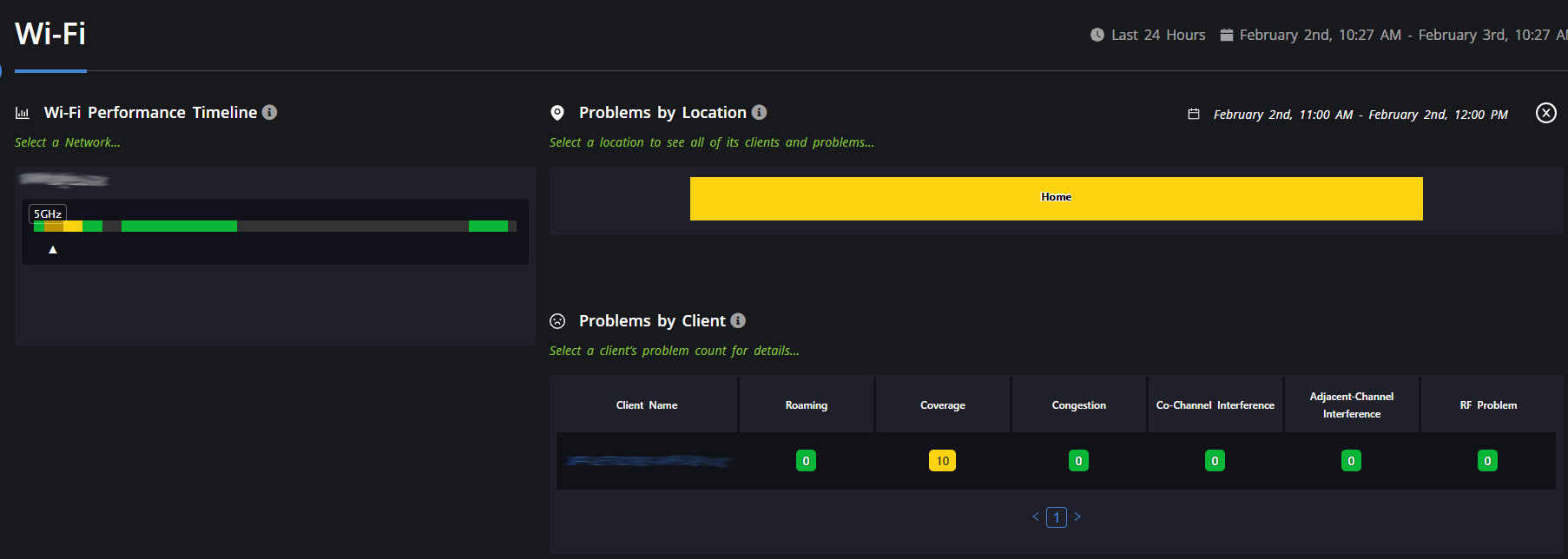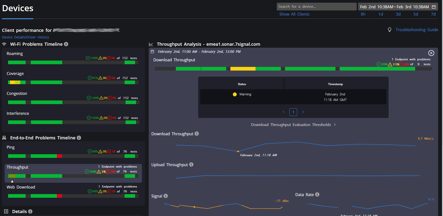 (3 of 5) Wi-Fi Performance/Coverage Detail for a Client Device (Example shows coverage issues at a particular time as experienced by a particular device)